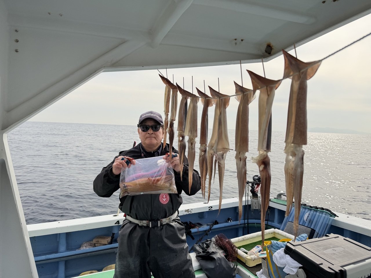 『大型1号で出船し洲崎沖180〜250m前後を攻めました。今日はお客様によってヤリイカが多かったりスルメが多かったりしました。皆様お土産GET!トップは26杯と好調でした!