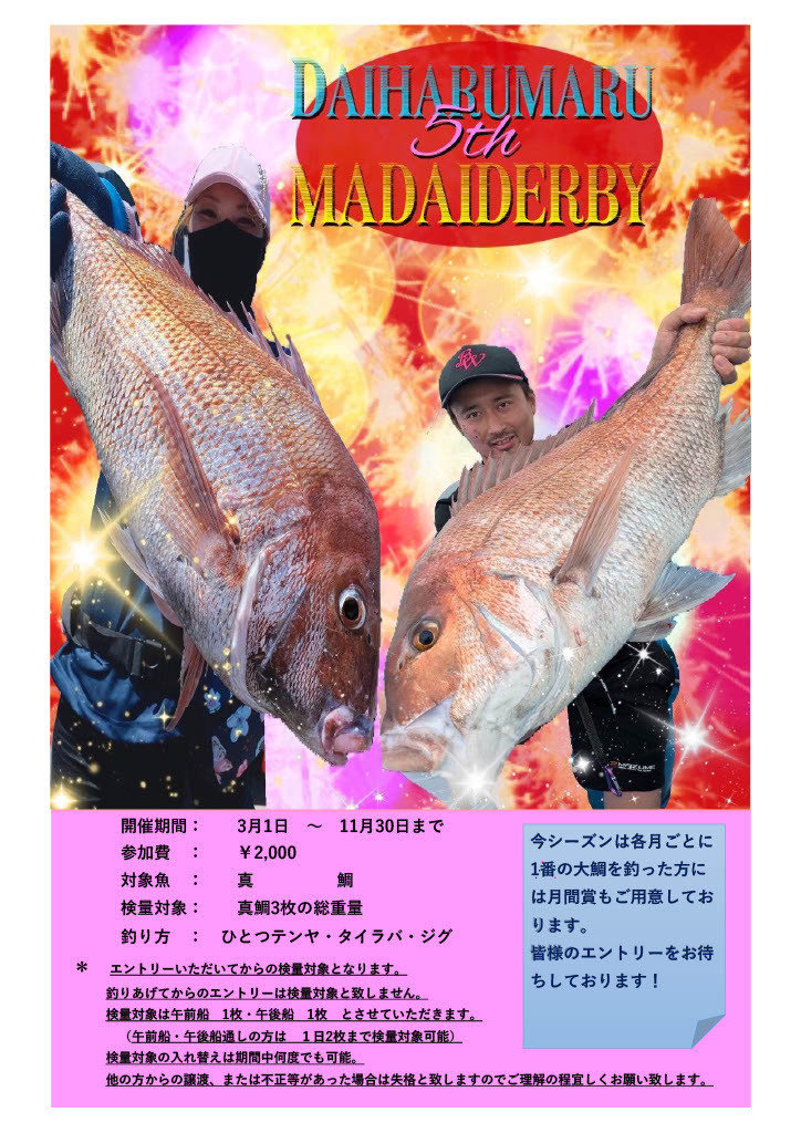 『テンヤ真鯛午後船!釣果0〜7匹(竿頭ヨ…