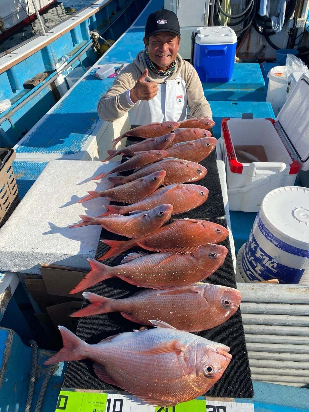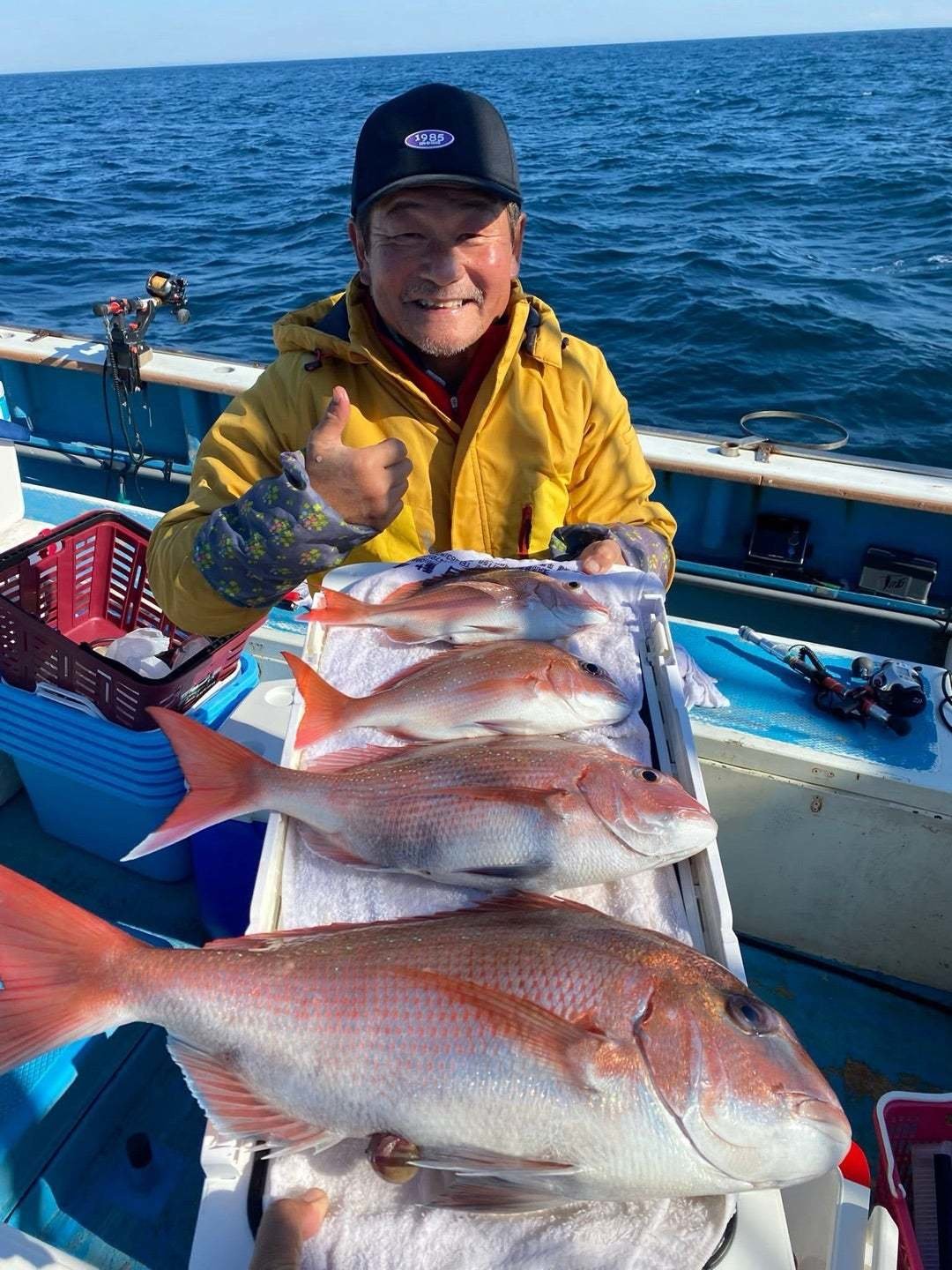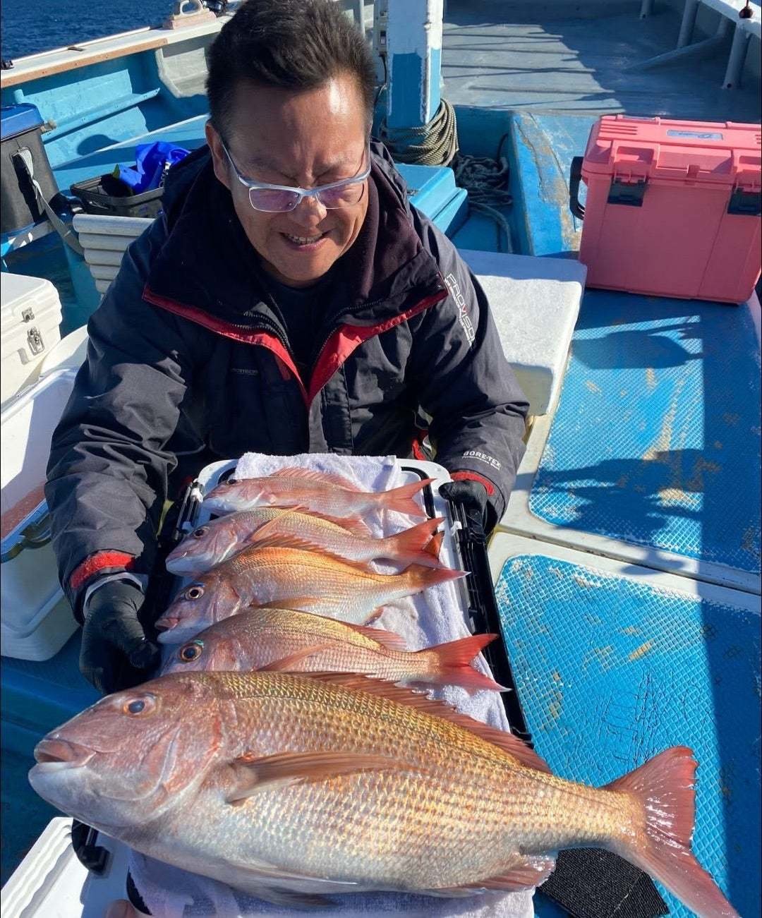 『今日のマダイ船。快晴ベタ凪、マダイの当…