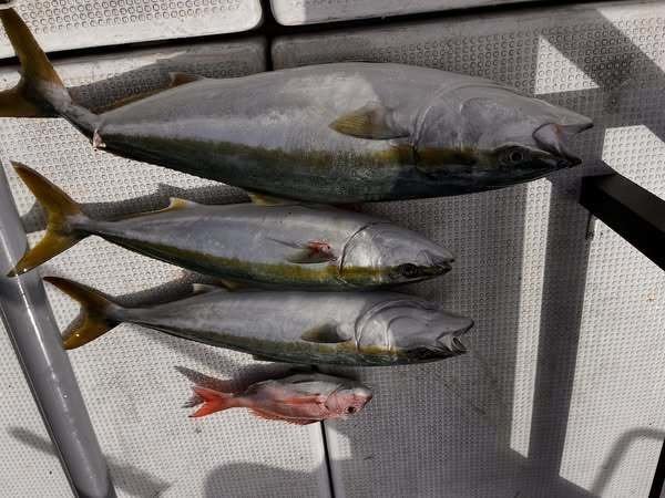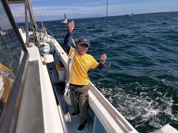 『本日は2馬力で太刀魚コースでした。青物は反応あったので少しだけしました。太刀魚は型もよく沢山食いました。本日のお客様頑張って頂き誠に有難うございます。今日釣れてくれた魚達ありがとう。』