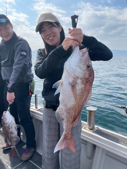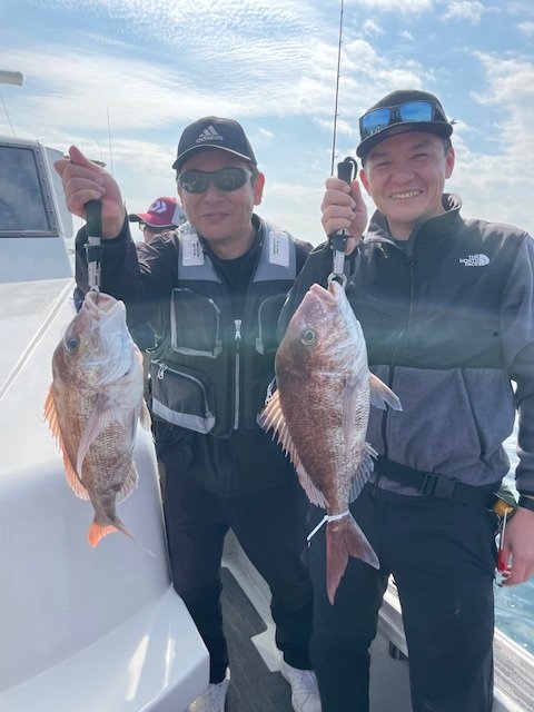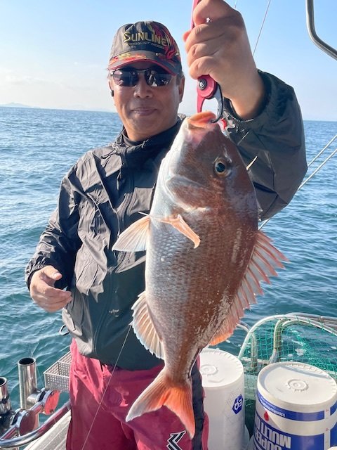 『本日は皆さんタイラバで遊びに来てくれました。増田さんグループは全員安打、安田さんグループは残念な結果に終わった方も居ましたが女性の川本さんが75cmを釣り上げ!他の方も真鯛のサイズが良く上がるたびに皆さんで賑わってくれてたのはありがたい事でした♪本日のご乗船ありがとうございました。写真はあまり撮れずにすみません。』