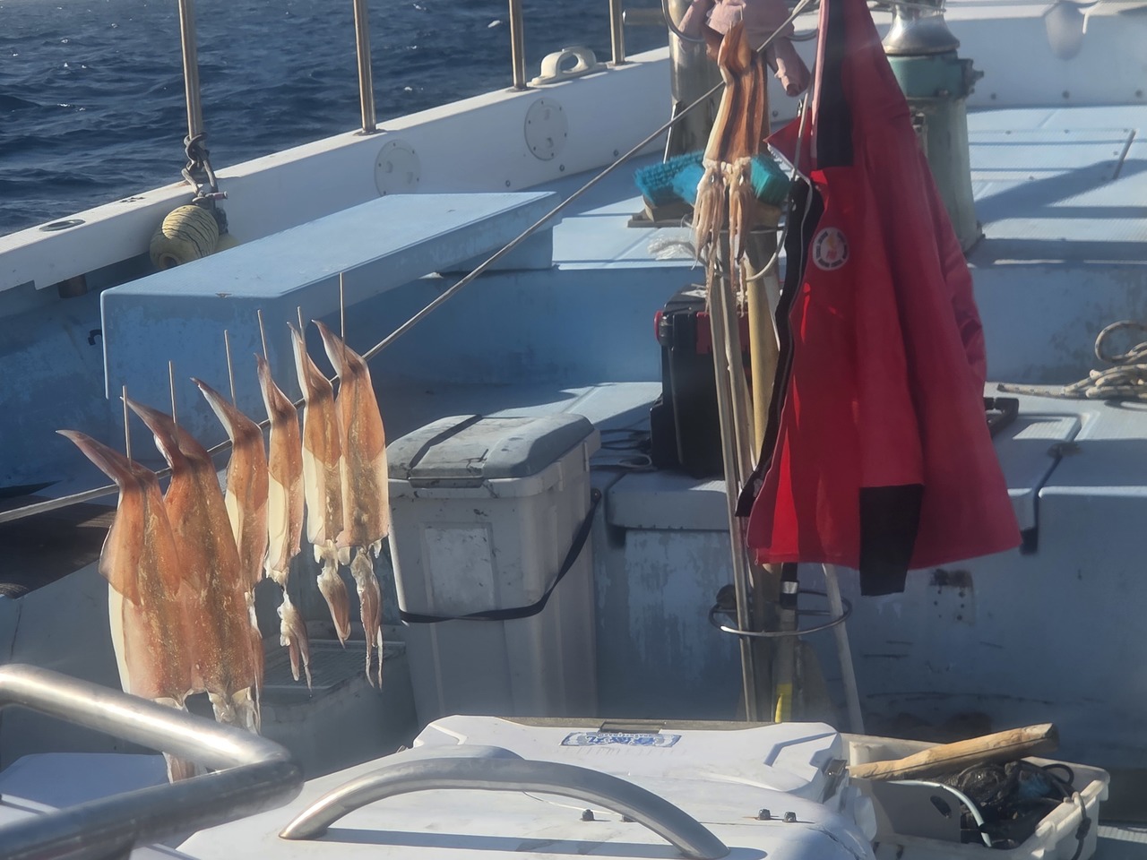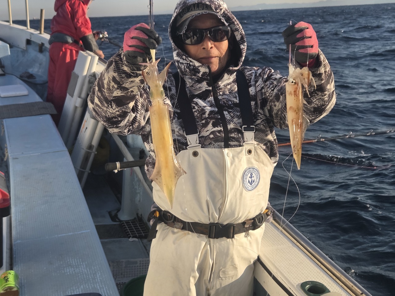『6時30分出船潮の流れは緩やかで、午前中ボツボツ釣れました。スルメイカも交じっています。プラ角11センチ又は14センチ深くなって来ましたので、オモリは150号でお願いします』