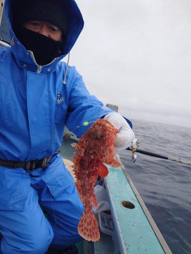 『北東風雨。ただただ寒く、お客さんもお地蔵さんに。今季お初チャレンジも潮流れず。鬼カサゴ・他クロムツ・ワニゴチ・アラ・頰黒メバルでした。