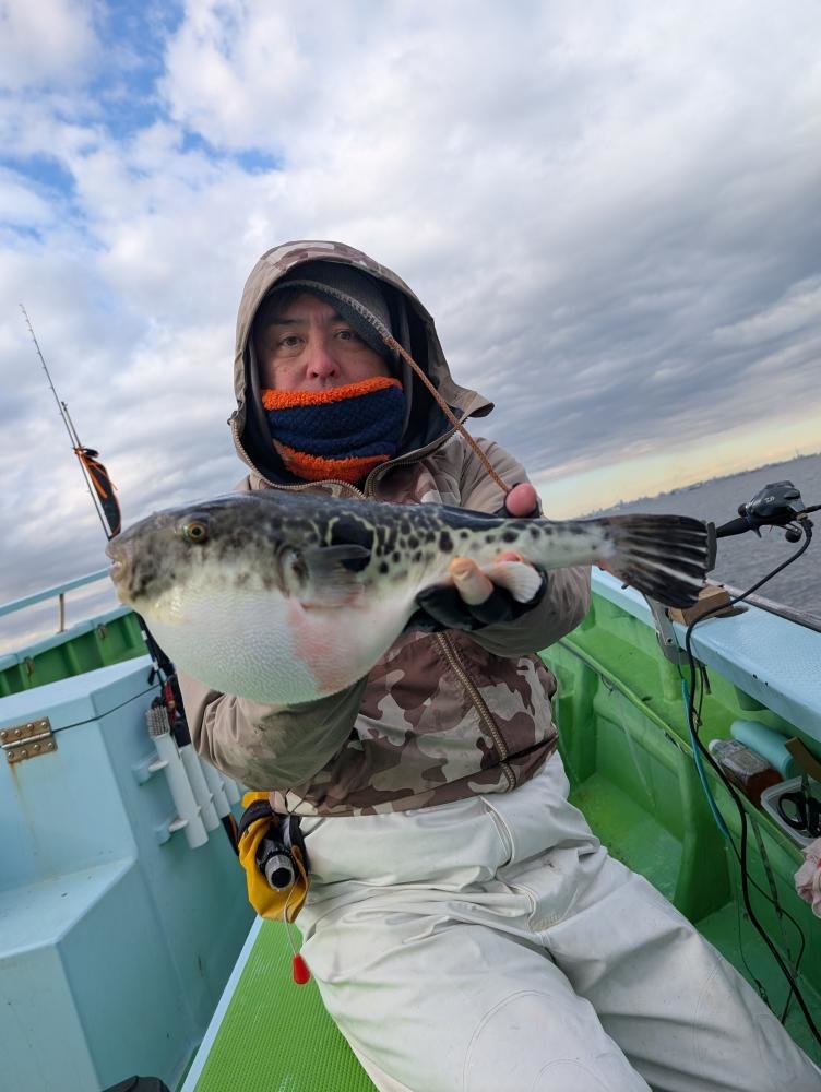 『虎フグ船。トラフグ専門!今日は出船出来ました。雪もちらつき極寒でしたがトップ5匹、2番手4匹で最大は1.4キロの良型ゲットでした』