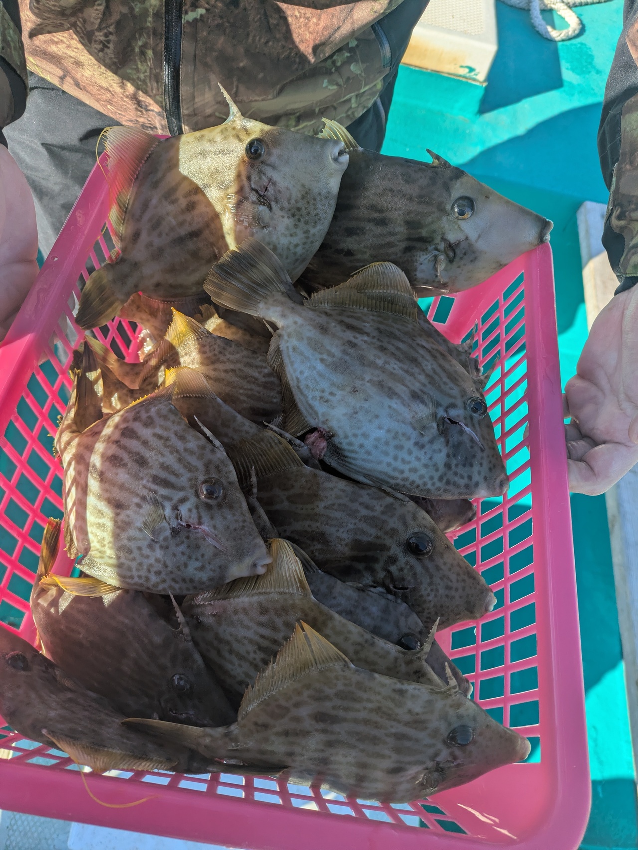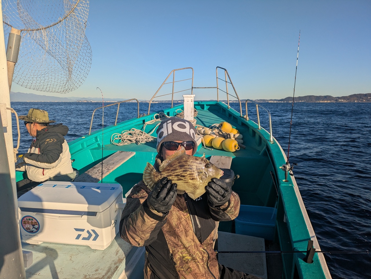 『本日カワハギ乗合に出船しました。朝のうち寒く氷がはってました。少しうねりありましたが、凪良く、水色も澄み活性良く、ポツポツと釣れました。さすがです。トップ21匹でした。まだまだチャンスありますので、よろしくお願いします。ありがとうございました。』
