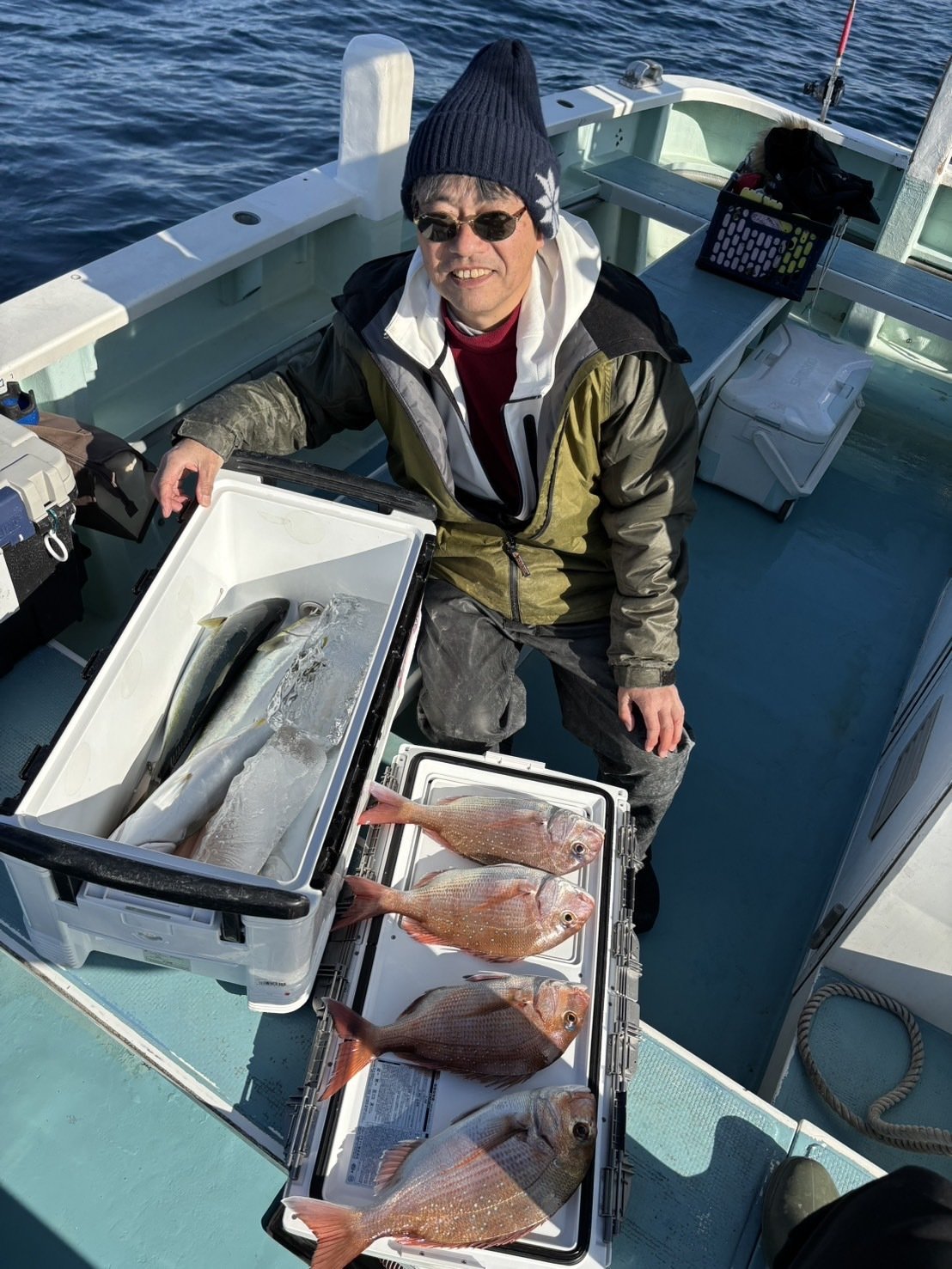 『朝からマダイの喰い良く、イナダ、クロダイ混じりでバラシもありましたが、マダイトップ6匹で皆様ボウズ無く釣る事ができました。明日もこの調子で頑張ります。31日も出船確定していますが、空き多数ありますので、予約のお電話お待ちしています。本日もご乗船いただきありがとうございました。』