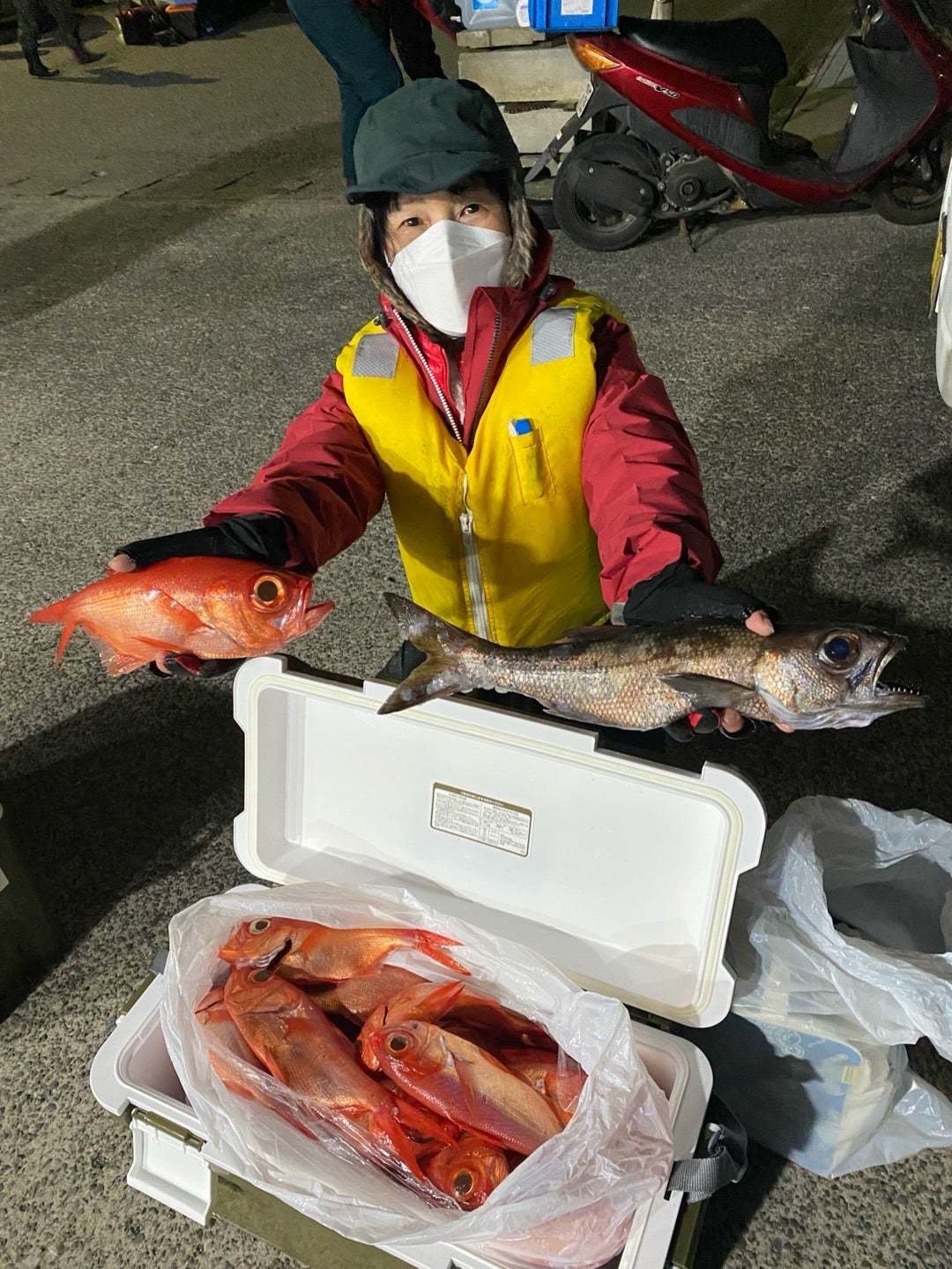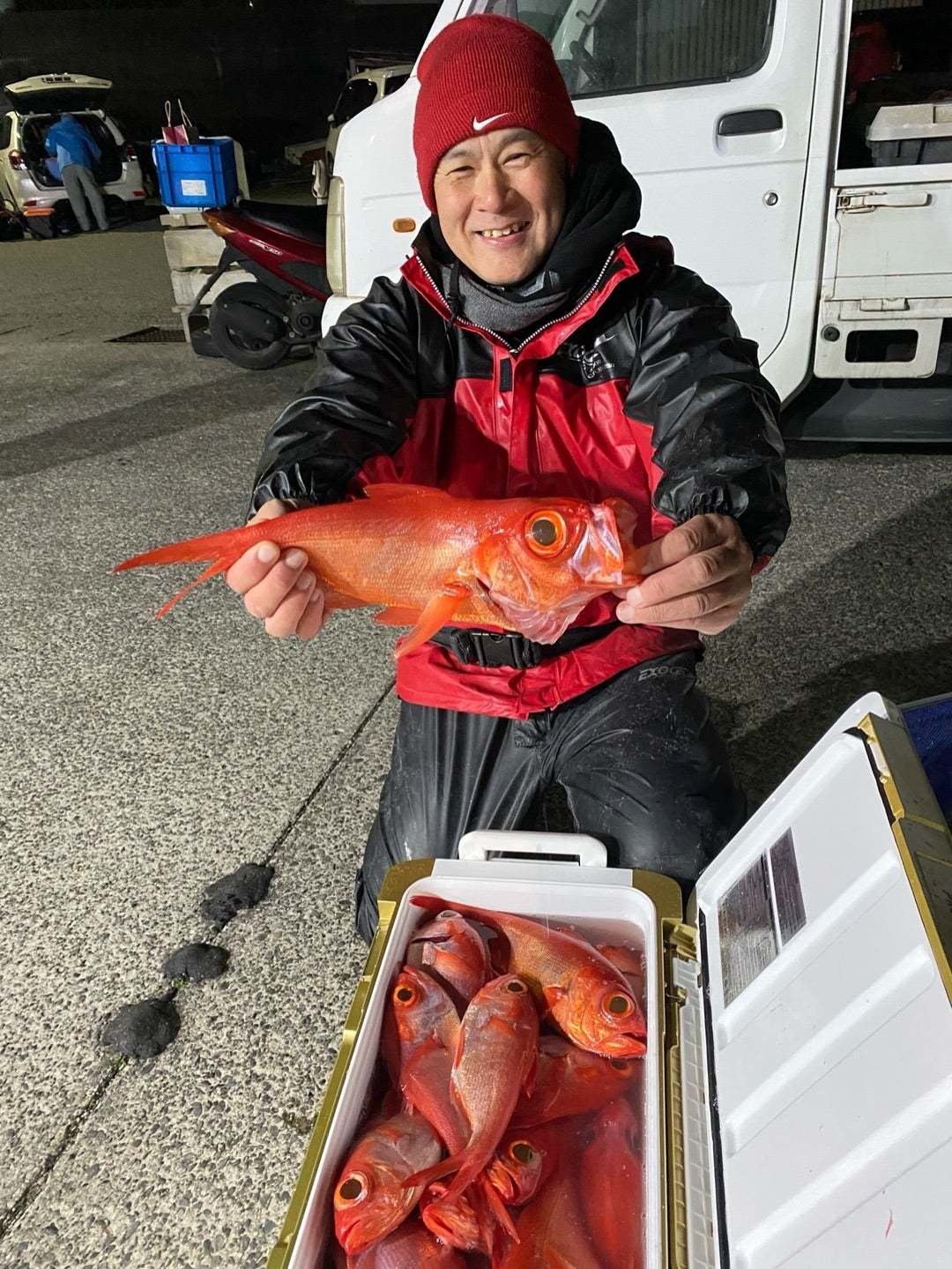 『昨夜(9日)は半夜キンメ船に出船してまいり、昨夜は半数のお客様が貸竿さん、初挑戦でしたが、昨夜も大型キンメちゃんのご機嫌も活発に、皆さん、おみやげバッチリ確保でしたよ〜!!!と、今日も張り切って出船したいところでしたが、今日は残念ながら時化予報のため、半夜キンメ船は出船を見合わせます。
