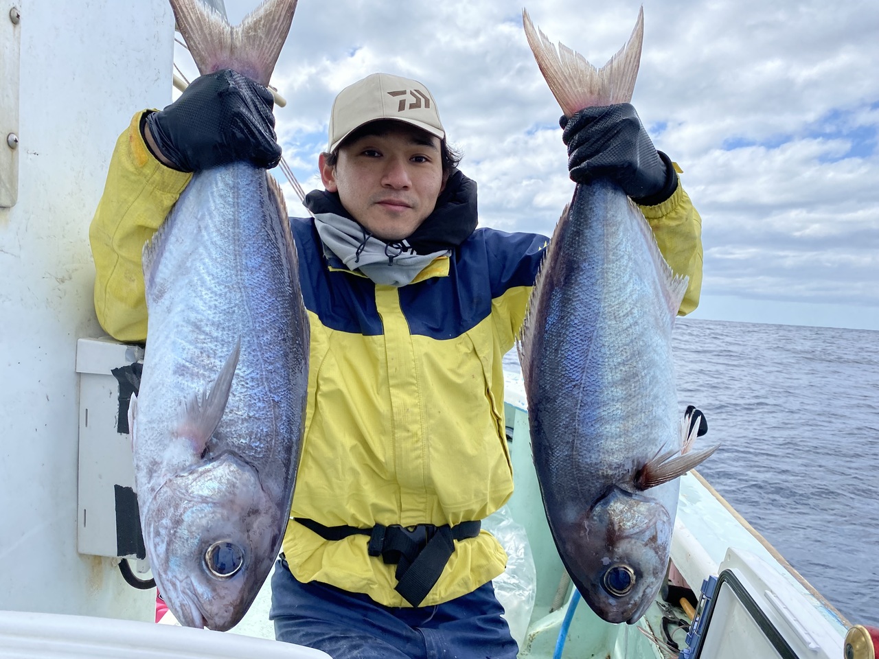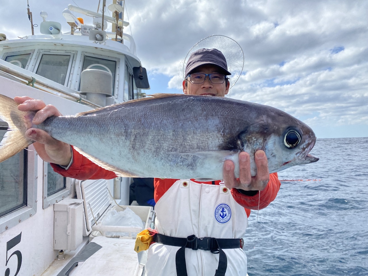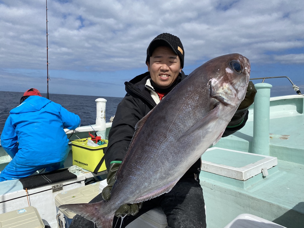 今日は利島沖のメダイ釣りに出船しました。前半は先日の風の影響でうなり何あり心配されましたがそれも予報通り収まってくれました。メダイの喰いは相変わらず順調な喰いでしたがサバが多く邪魔になりましたね!サバ餌の方は良く釣れていました。2枚の方は残念ながら船酔いのようでした。』