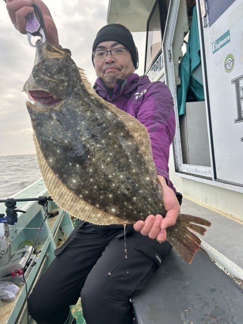 『午前船。ヒラメ船は水深5〜17m。潮の流れ不足でしたが、食えば良型でした。濁り。』