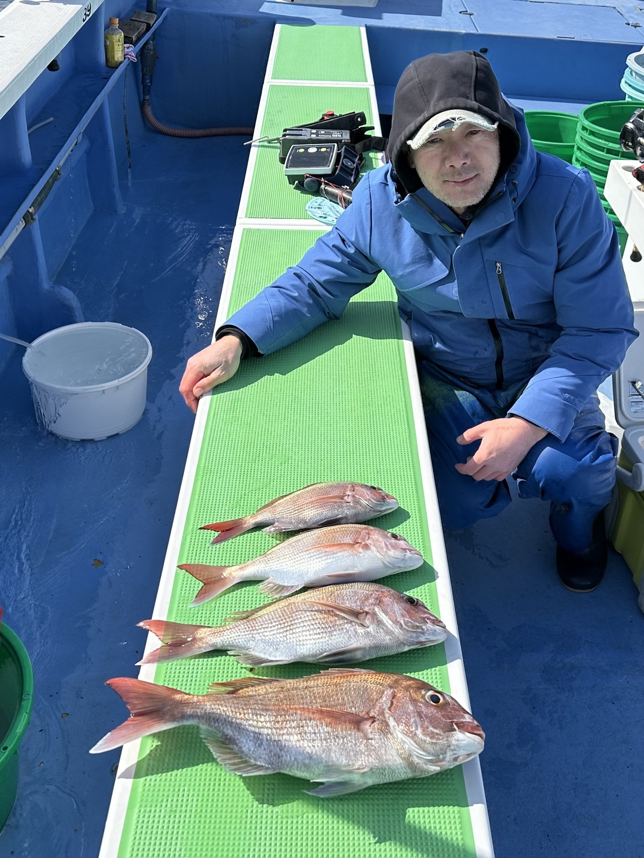 『大型3号で出船し久里浜沖を攻めました。マダイは終日ポツポツと釣れました。トップは5枚、次いで4枚でした!