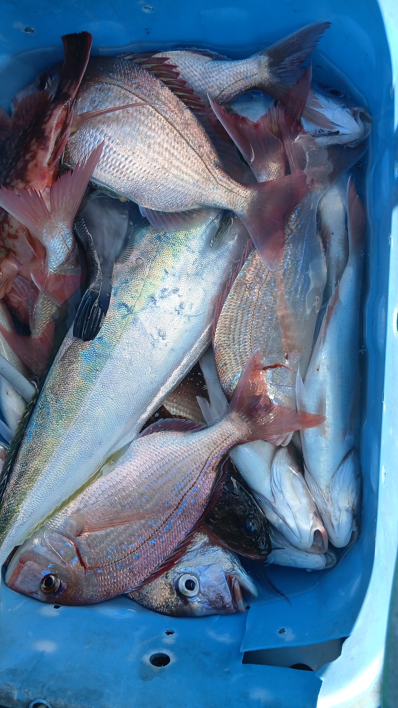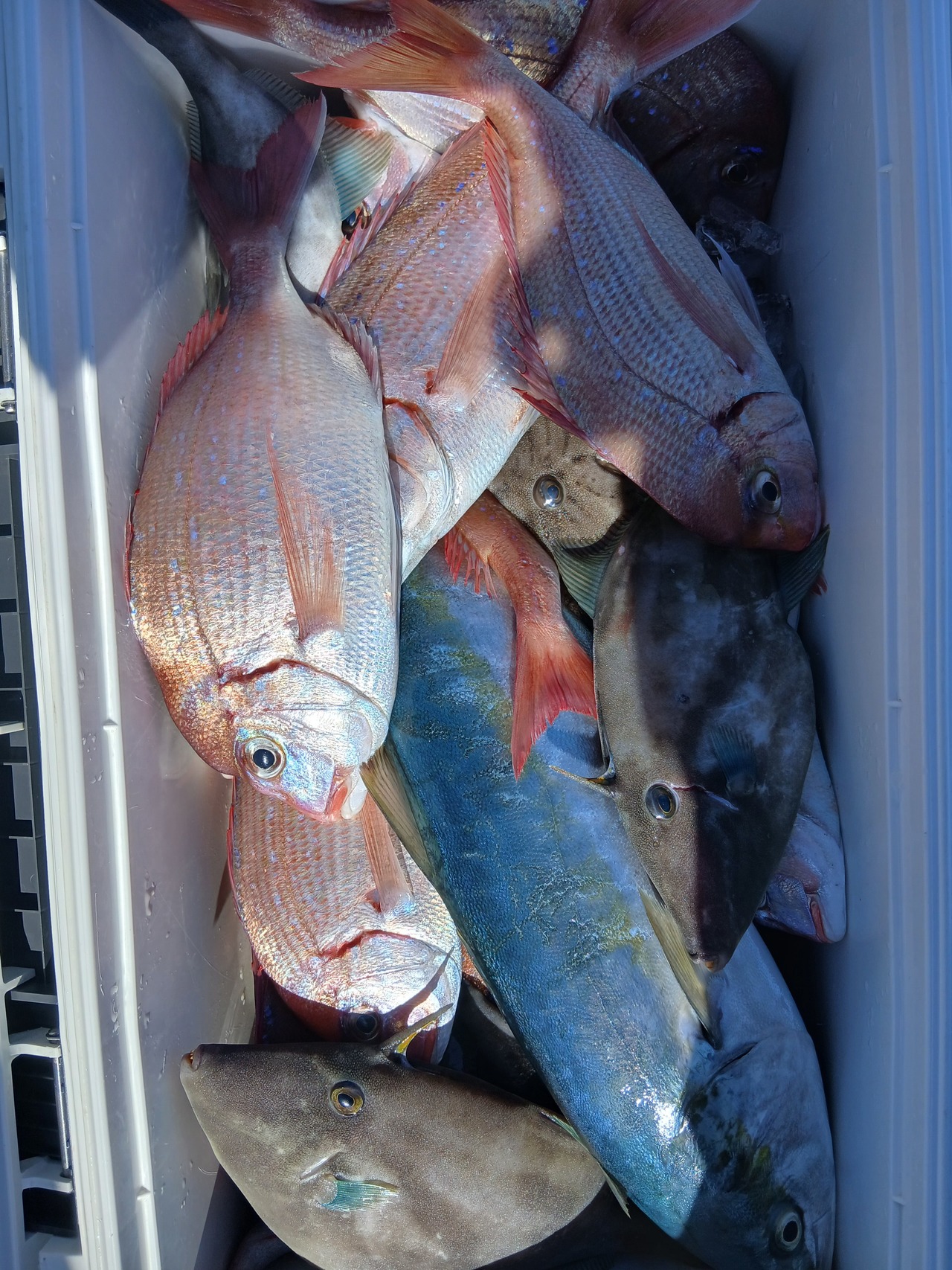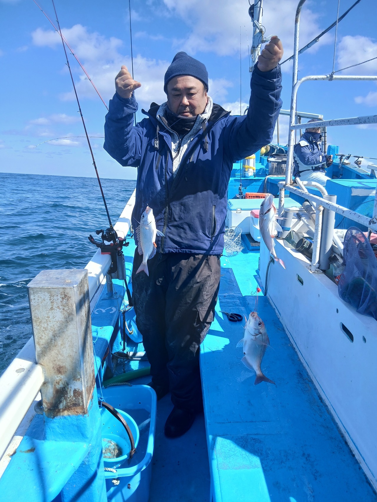 『久しぶりに出船できました。海上ウネリはありましたが、朝からタイ食い良く合わせのタイミングがあった方はクーラー満タンでした外道ハナダイ、メバル、ソイ、ホウボウ、カサゴ、ハタ、イナダ、イシダイ、カンダイ、カワハギなど多彩に混じりました。朝から入れ食い状態でしたのでお客様ニコニコでした。竿頭岩渕さんマダイと外道混じり46匹、次頭須貝さん36匹でした。早く海が良くなれば良いですね』