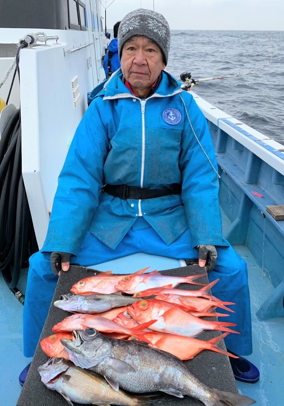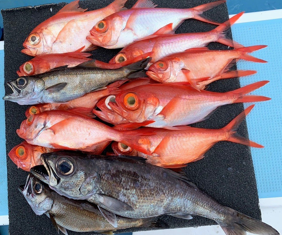 『今日17日は曇りベースながら午後からは晴れ間も見られ、風は北の微風で海はべた凪。絶好の釣り日和で出船する事が出来ました。今日も沖ノ瀬に出船しましたが、朝のうちはクロムツに占領され(それはそれで嬉しいですけど・・・)キンメの当たりは今一でしたが、後半はキンメが好調に当たり、デカムツも交じり絶好調でした。中にはクーラー満タンの方も・・・