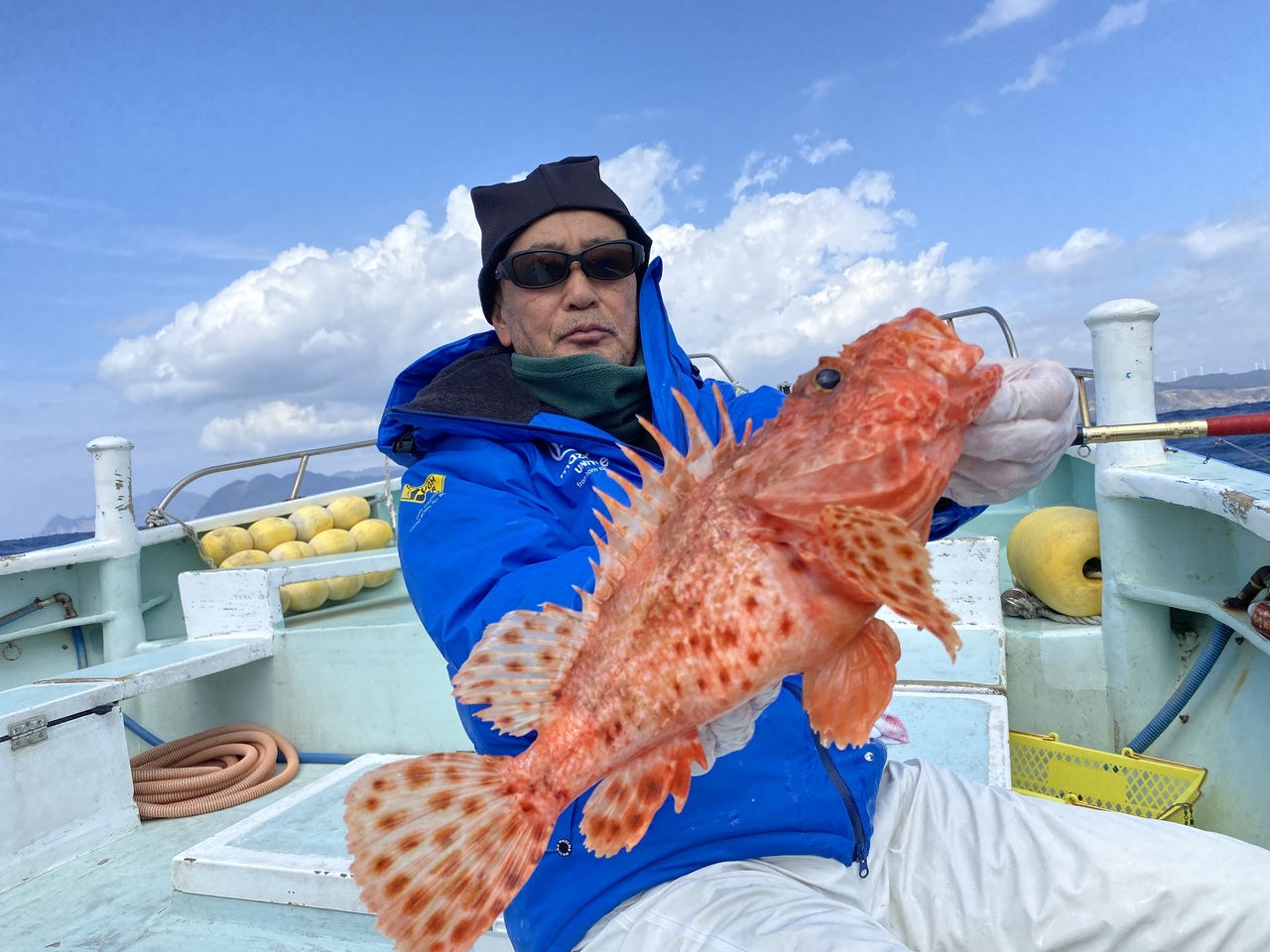 『今日は北東の風がやや吹いていたので風影の石廊崎沖のオニカサゴ釣りに出船しました。底潮が流れなく苦戦を強いられましたがポイント移動を繰り返し何とかお土産になりました。その他のゲストにはカンコやフサカサゴなど多彩でした。』