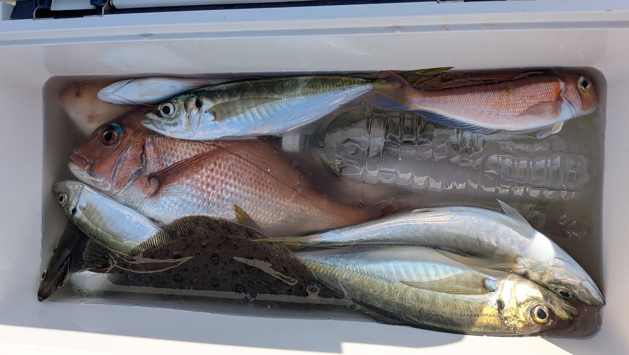 、ホウボウ、イトヨリとアタリ多くもその後渋く潮変わるとデカアマダイも顔出し少し活性良くなった。