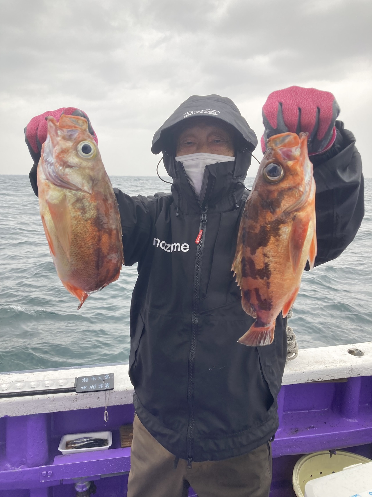 『本日は海上、南西の風強く、メバルのポイント、多く周れず苦戦しましたが、お客様、少人数で、皆さん、メバル型大きく、カサゴも釣れて、お土産になりました!